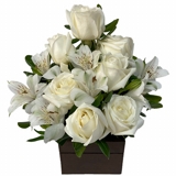 Arranjo confeccionado com 07 rosas nacionais na cor vermelha, gypsophillas e folhagens no cachepô de madeira branca.