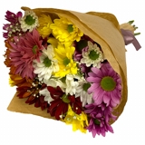 Arranjo confeccionado com 04 gérberas coloridas e gypsophila no cachepô de madeira branca.