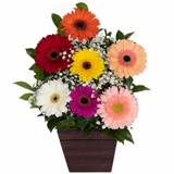 Arranjo confeccionado com 1 rosa colombiana vermelha, 1 girassol e Gypsophilas (mosquitinho) no cachepô .