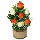 Arranjo confeccionado com 07 rosas nacionais na cor branca, astromelias brancas e folhagens no cachepô.