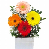 Buquê confeccionado com 06 flores do campo coloridas.