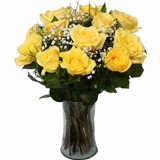 Cesta de vime confeccionada com 15 rosas nacionais coloridas e gypsophila.